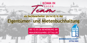 Die WBG Zittau ist ein modernes, regional verwurzeltes Wohnungsunternehmen mit einem vielfältigen Immobilienbestand. Zur Verstärkung unseres Teams suchen wir zum nächstmöglichen Zeitpunkt einen Sachbearbeiter (m/w/d) für die Eigentümer- und Mietenbuchhaltung.